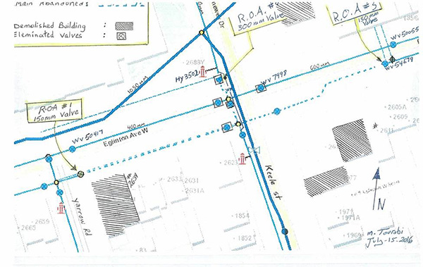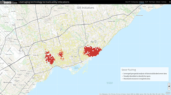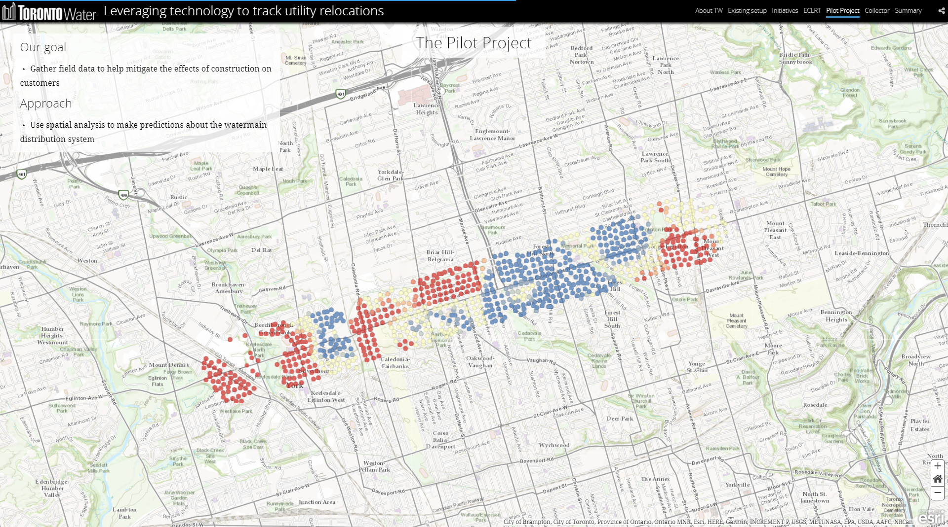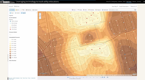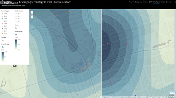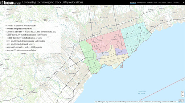 トロント市では、2021 年に新たな路面電車 Eglinton Crosstown LRT(Line 5 Eglinton)の開通が決定し、線路のルートや工事で影響を受ける上下水道管や設備を移設することになった。移設にあたっては、利用者への影響を最小限にすることを目的に ArcGIS Online と Collector for ArcGIS を使って現地調査で収集した情報を元に空間分析で配水システムへの影響を予測することとなった。