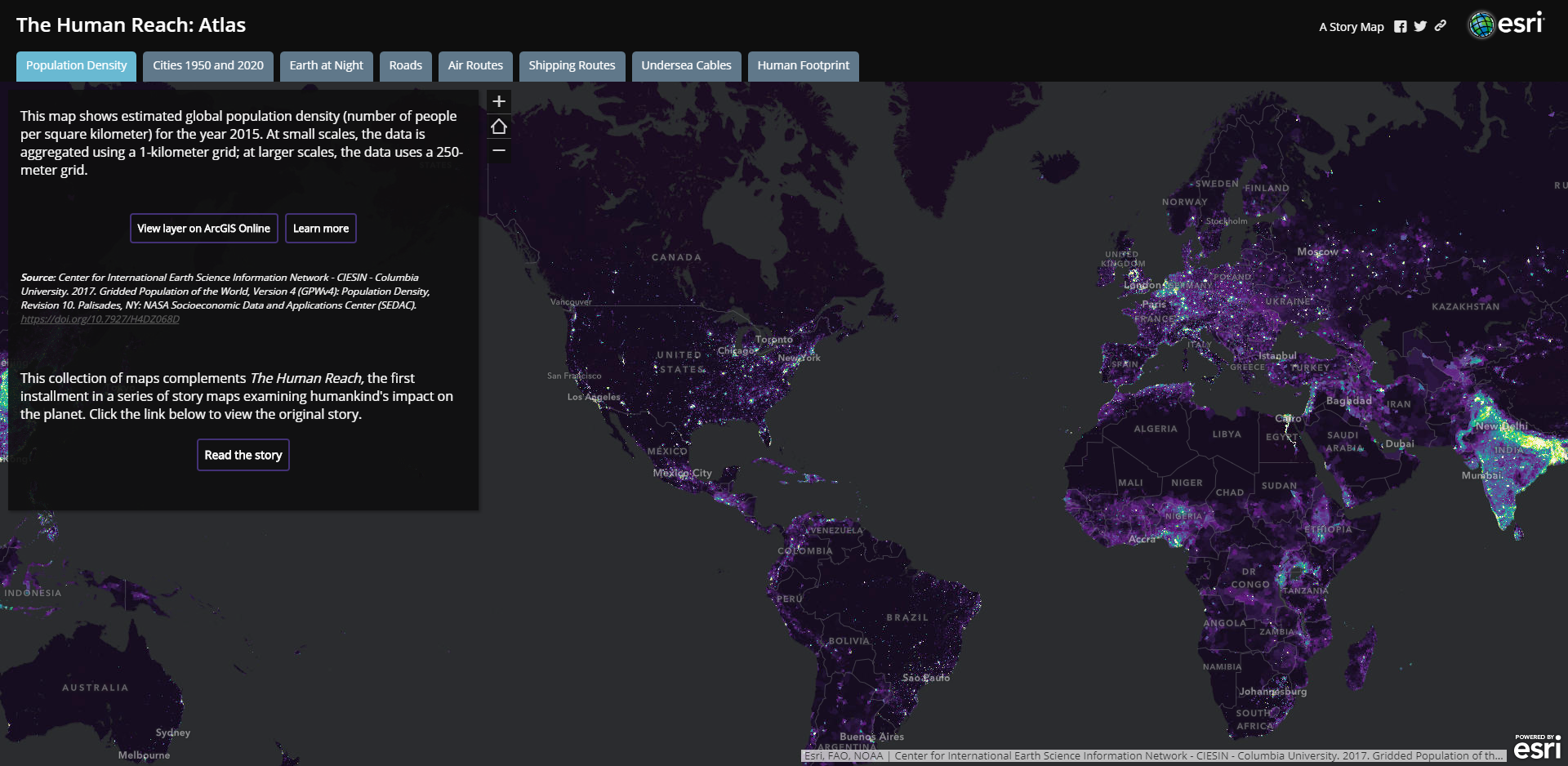 本マップでは、全世界の主要な道路や、輸送交通、飛行経路などの世界中の繋がりを見ることができます。また、各都市の人口密度や、夜でも明るい都市など、世界中の人間の活動の様子を地図上に可視化しています。