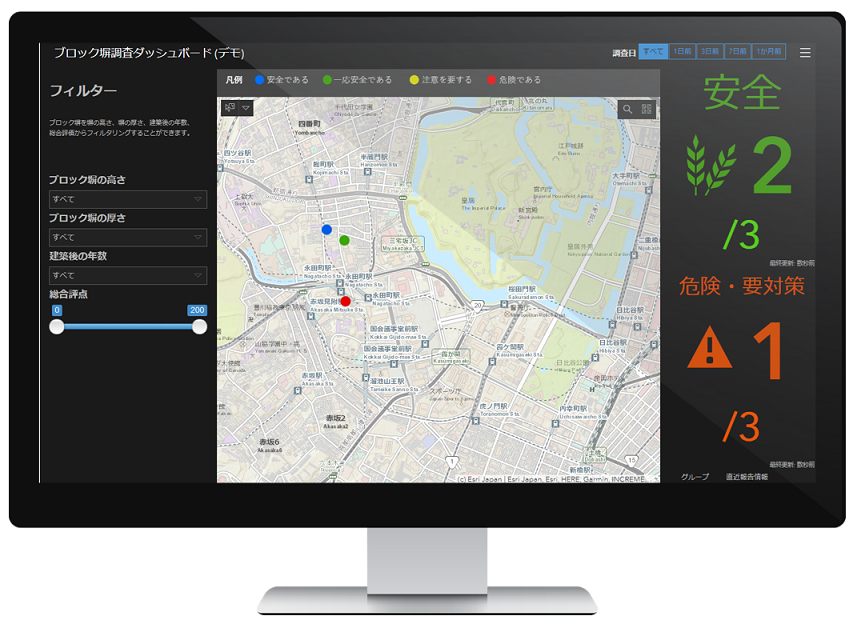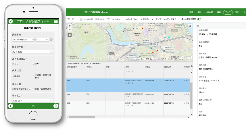 Survey123 for ArcGIS を使用してブロック塀の情報を収集し、ArcGIS ポータル上に配置した GIS データに情報を蓄積できるように設計されています。また、収集した情報のサマリーや個々の情報を Survey123 Web サイトを使用して確認することができます。