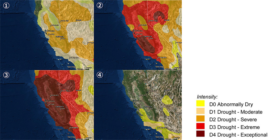 カリフォルニア州では渇水や干ばつは珍しいことではない。1895 年の観測開始以来、州は長期間に及ぶ干ばつに幾度も苦しんできた。史上最も乾燥した期間は 1974 年から 1977 年までである。