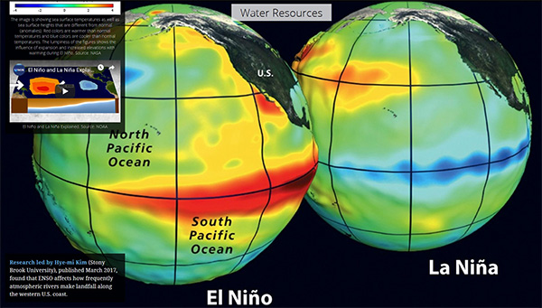 エルニーニョは、カリフォルニアで冬に雨や雪を降らせる傾向があるが、過去の記録には多くのばらつきがある。また、ラニーニャは、しばしばカリフォルニアの冬の干ばつに関連している。