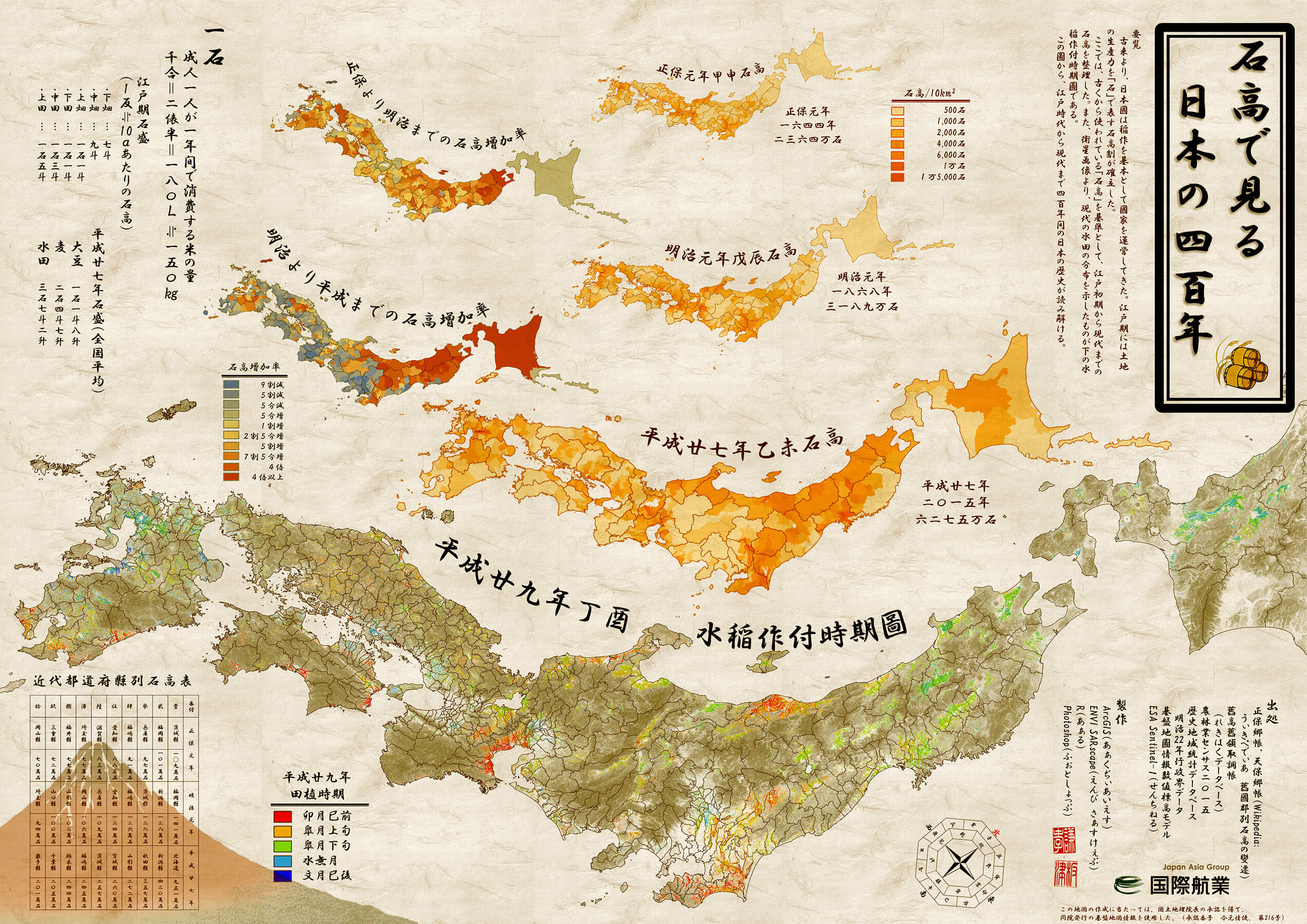日本では昔から「米」を中心とした国家運営を行ってきました。江戸時代以降は村毎の石高が記録されています。そこで、現在の農業統計から収穫量を石高に換算し、さらに水田の分布と比較することで、400 年間の生産量の変遷と日本の歴史が読み解けます。 このマップは衛星画像も含めフリーのデータから作成し、GIS とリモートセンシングと歴史の融合を目指しました。
