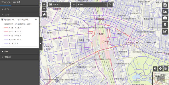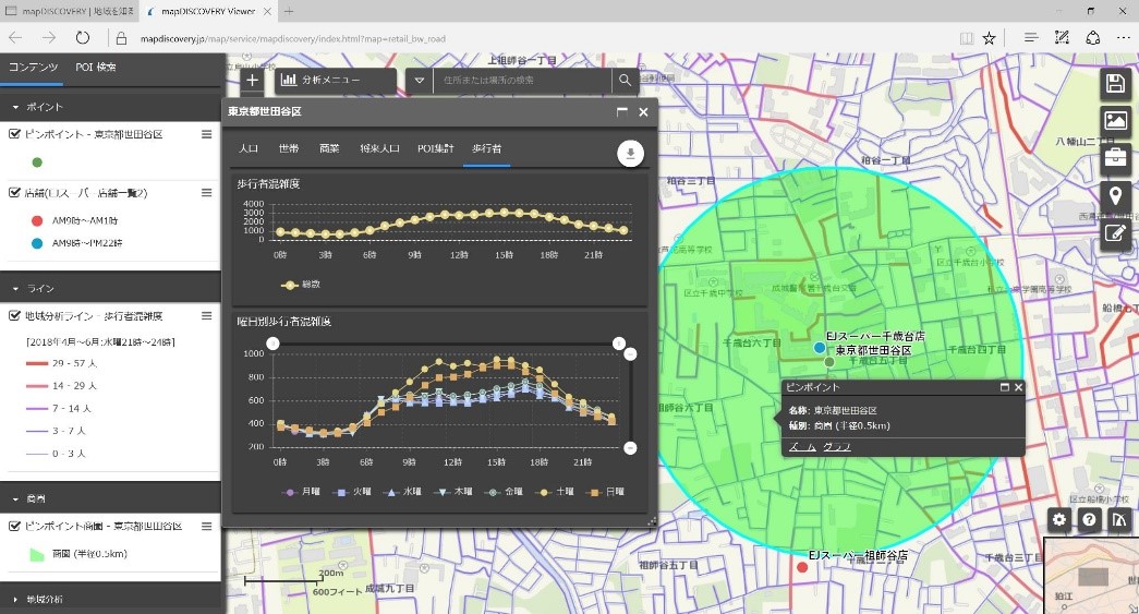 地理情報システム(GIS)ソフトウェア国内最大手*1 のESRIジャパン株式会社(本社:東京都千代田区、代表取締役社長:正木千陽、以下「ESRIジャパン」)と、株式会社ブログウォッチャー(本社:東京都中央区、代表取締役:酒田 理人、以下「ブログウォッチャー」)は、ブログウォッチャーの位置情報データプラットフォーム「プロファイルパスポート」で保有する位置情報データを、ESRIジャパンのクラウド型GISサービス「mapDISCOVERY®(マップディスカバリー)」に連携し新たなオプションサービス、「歩行者混雑度オプションサービス」を7月16日にリリースしました。これにより特定地域・特定時間の歩行者混雑度を視覚的に素早く把握することが可能になります。ESRIジャパンとブログウォッチャーは、様々な企業へデータ連携することで、さらなる位置情報データの利活用促進を目指します。