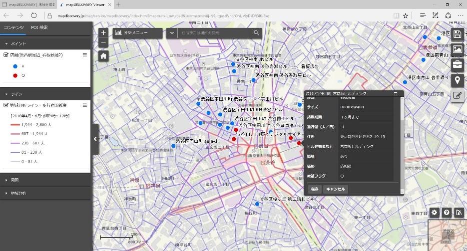 新商品の屋外販促用に看板物件の候補地リストを地図上に可視化し、歩行者の多い場所を選定していきます。これにより効果的な屋外看板の設置が可能となります。