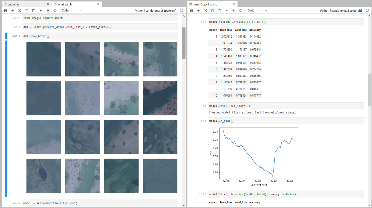 また、ディープ ラーニングに関するクラス (arcgis.learn.UnetClassifier) も新たに追加され、U-net と呼ばれる手法を用いて衛星画像等の分類 (画像セグメンテーション) のためのディープ ラーニング モデルを作成することができるようになりました。