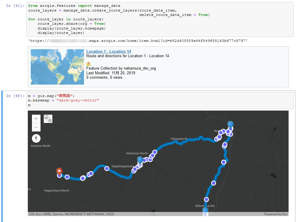 また、find_routes、find_closest_facilities メソッド等で解析結果のルート データを保存することが可能になりました。保存されたルートデータを元に、こちらも新たに追加された create_route_layers メソッドを使用してポータル上にルート レイヤーを作成することができます。