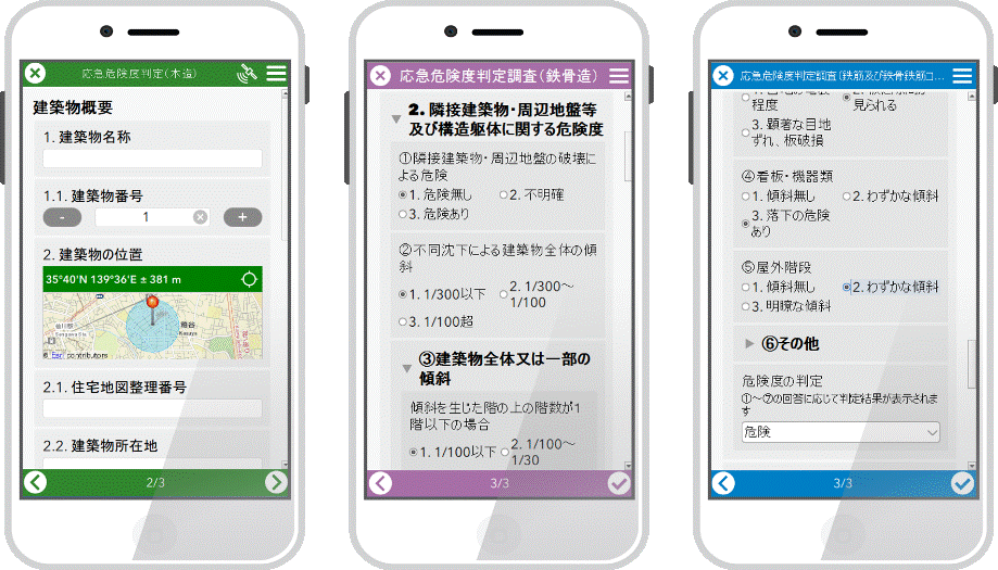 本テンプレートを利用することで、iOS / Android / Windows デバイス上で応急危険度判定調査が実施できるようになり、調査時に課題となる資機材の調達や準備の効率化、調査の入力から集計までの迅速化等に貢献します。