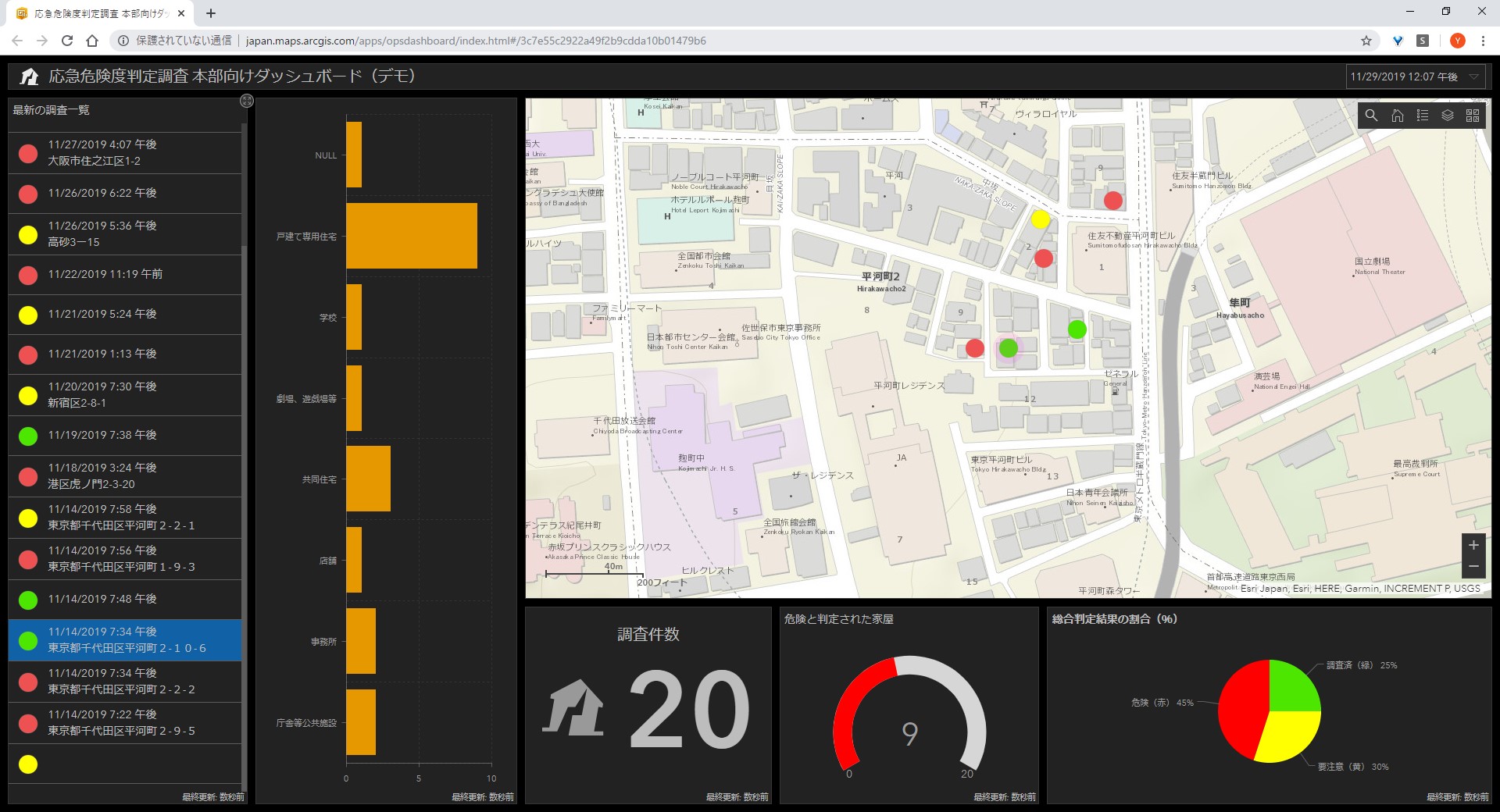 応急危険度判定調査は、地震災害等において、余震等による建築物の倒壊や落下物等による二次災害を防ぐため、発災直後に被災した自治体が主体となり迅速に行われる建築物の危険度の判定調査です。この度、ESRIジャパンは、建築研究所におけるこれまでの応急危険度判定支援ツールの開発や実証訓練等で培った知見にもとづく協力を得て、被災自治体における応急危険度判定調査の課題解決に貢献するテンプレートを開発しました。