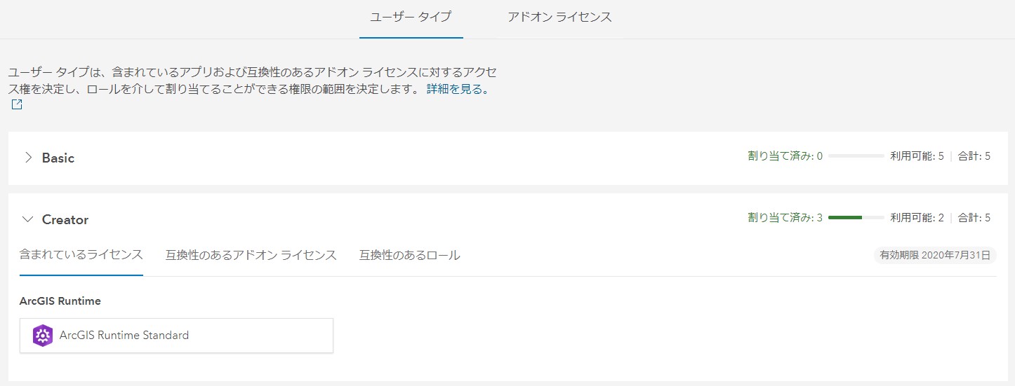 バージョン 100.7.0 では、ArcGIS Online または、ArcGIS Enterprise 次期バージョンの10.8(国内リリース時期未定)以降の指定ユーザーを使用してStandard、および Advanced ライセンス レベルと Analysis エクステンションを有効にすることができるようになりました。これにより、Lite、Basic、Standard、Advanced すべてのライセンス レベルを指定ユーザーのログイン認証でご利用いただけます。