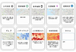 第1弾として提供するGISカードは、防災をテーマにしたカードです。「ハザードマップ」「人口密度」などのレイヤーに加えて、インクリメント・ピー株式会社が提供する「公共施設」や「避難施設」などのレイヤーを含んでおり、詳細かつ最新のデータを、授業や自主学習の場ですぐに使うことができます。