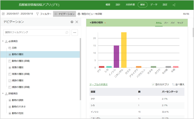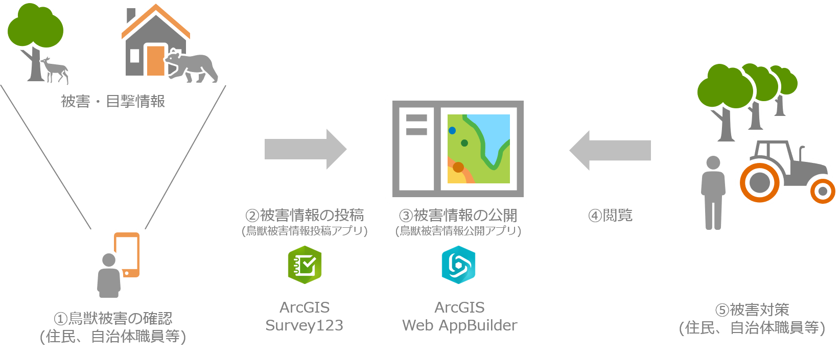 「鳥獣被害情報投稿アプリ」は ArcGIS Survey123 を使用しており、投稿された情報は ArcGIS ポータル上に配置した GIS データに蓄積されるように設計されています。また、収集した情報のサマリーや個々の情報は Survey123 Web サイトで確認することができます。
