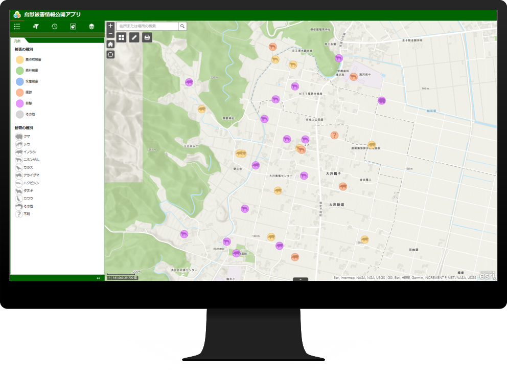 動物の種別に応じた表示のフィルタリングや時間による鳥獣被害の発生状況の確認、地図の印刷など鳥獣被害の防止や低減に向けた取組みを支援するための様々な機能が利用できます。