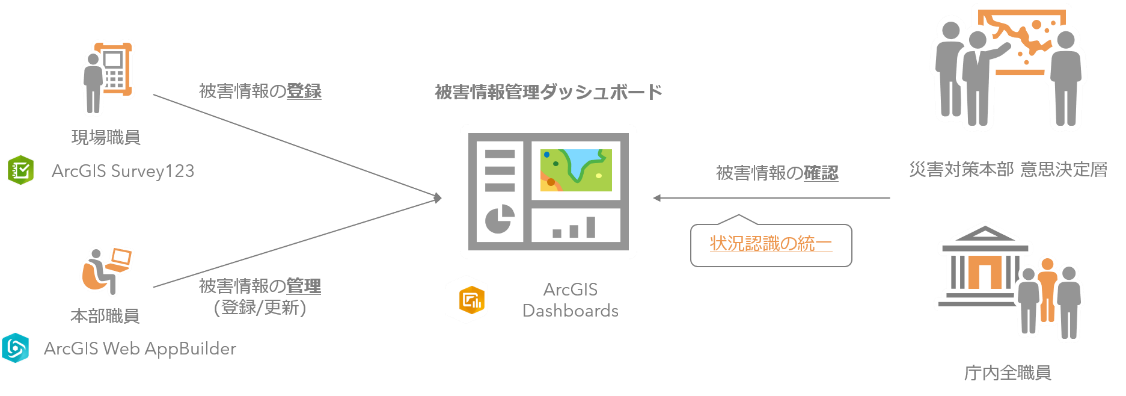 災害時初動対応テンプレートは ArcGIS ポータル(ArcGIS Online)に地震や台風等の自然災害によって発生した被害や、各地域に対する避難情報の発令状況、避難所の運営状況を管理するための環境を構築するソリューション テンプレートです。