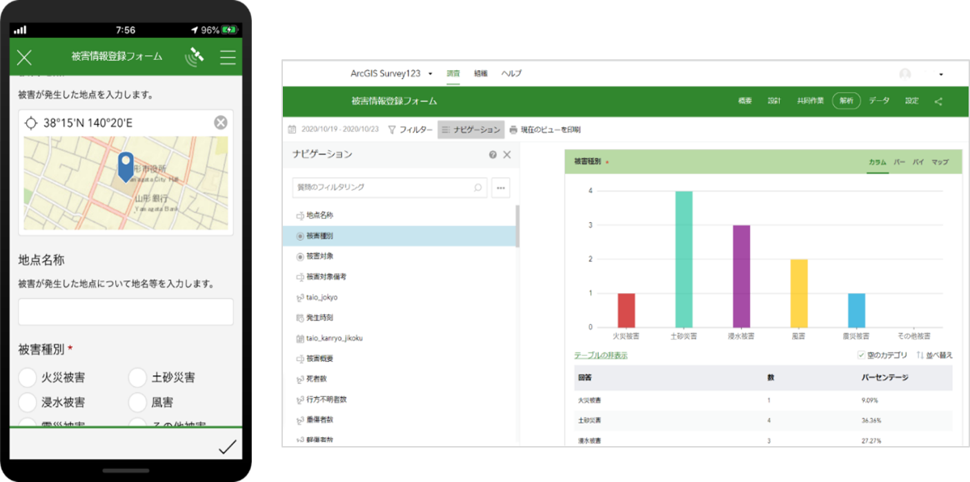 被害情報登録フォームや災害情報管理アプリから入力された情報をリアルタイムに確認するダッシュボード アプリです。チャートで被害種別や人的被害の情報を選択することで地図に表示されているポイントが絞り込まれ、災害情報を動的に確認することができます。