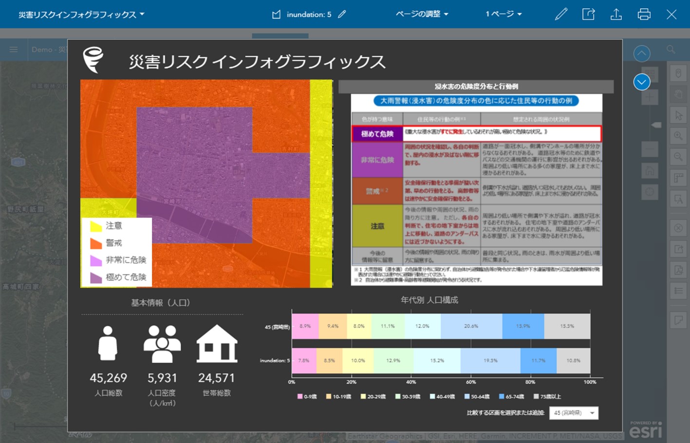 また、ArcGIS 上には国勢調査などの人口統計データが搭載されており、任意エリアの人口や世帯数を集計することができます。この機能と防災気象情報を組み合わせ、集計結果をレポート形式にまとめることにより、各種災害リスクが高まっているエリアの人口や世帯数、その年代構成などを迅速に把握することができます。これにより、たとえば自治体では、災害リスクの種類や人口規模・特性に応じて、適切な避難所を設置する助けとなります。