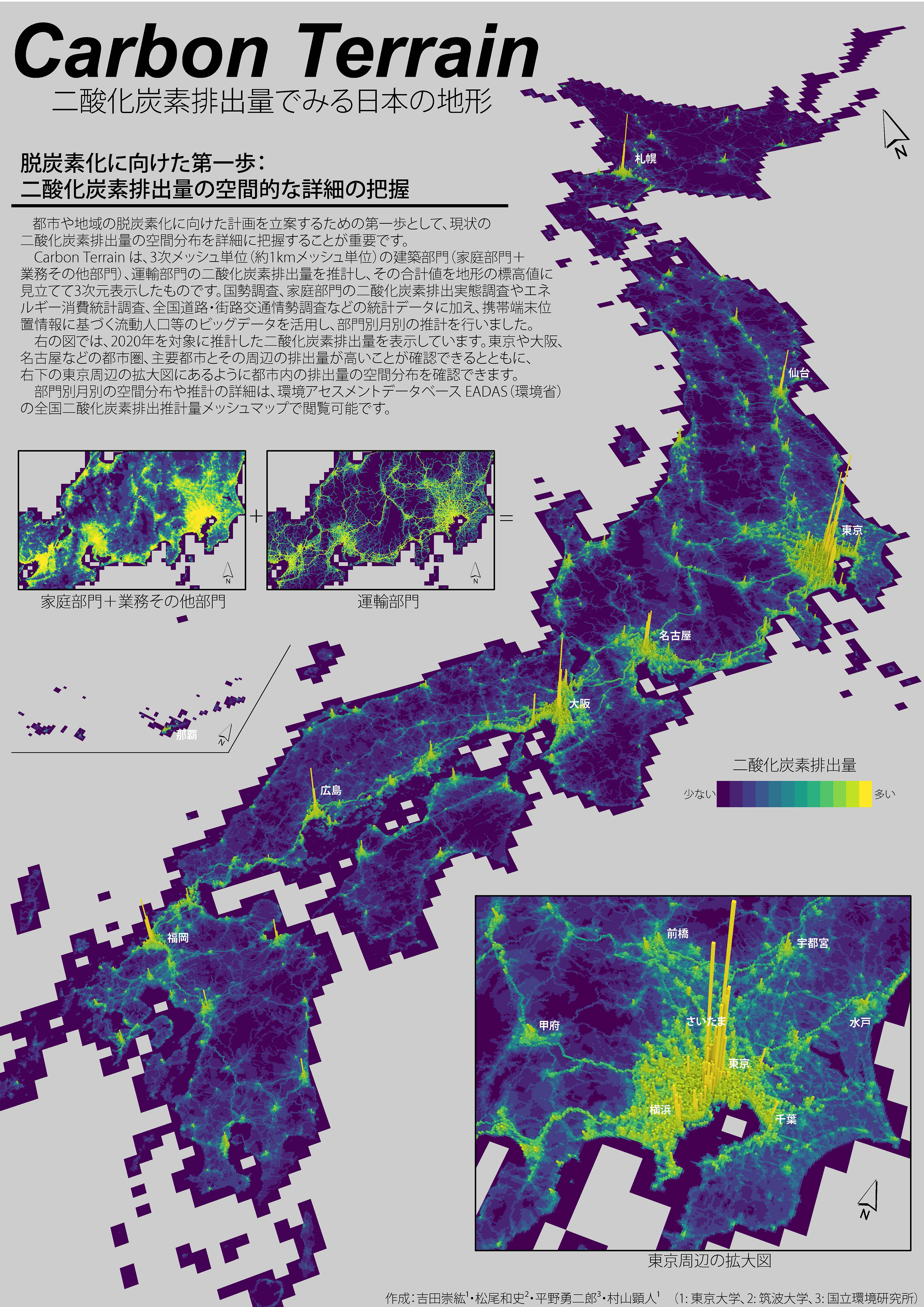 都市や地域の脱炭素化に向けた計画を立案するための第一歩として、現状の二酸化炭素排出量の空間分布を詳細に把握することが重要です。Carbon Terrain は、3 次メッシュ単位(約 1km メッシュ単位)の建築部門(家庭部門+業務その他部門)、運輸部門の二酸化炭素排出量を推計し、その合計値を地形の標高値に見立てて 3 次元表示したものです。部門別月別の空間分布や推計の詳細は、環境アセスメントデータベース EADAS(環境省)の全国二酸化炭素排出推計量メッシュマップで閲覧可能です。