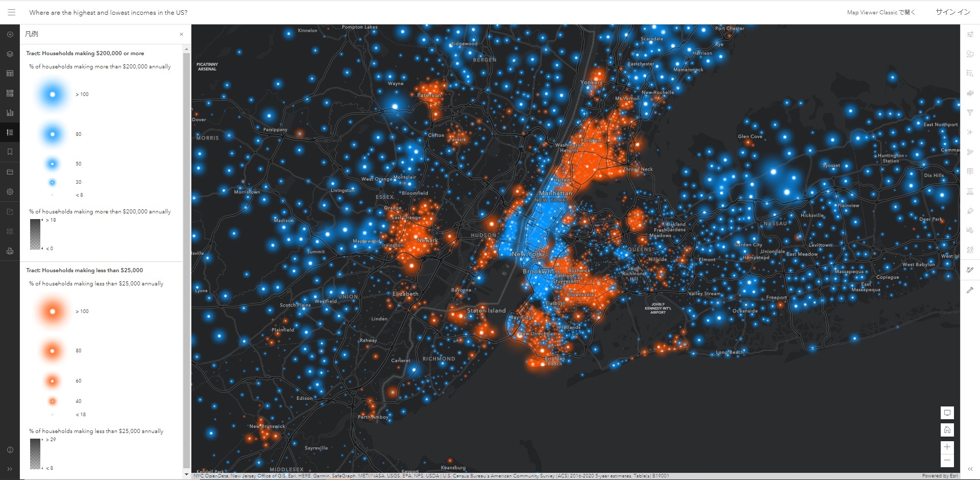 アメリカ国内で年間の所得が US$200,000 以上の世帯と $25,000 以下の世帯がどこにいるか一目でわかってしまうマップを紹介します。
