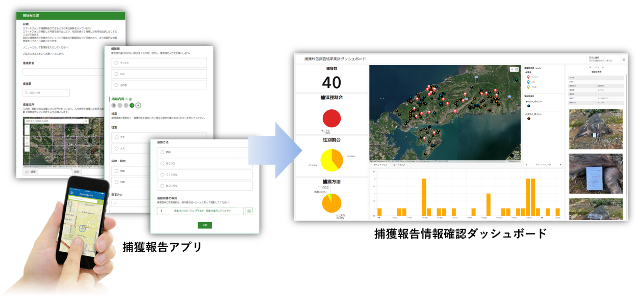 有害鳥獣の捕獲者は捕獲報告の際、捕獲者は、捕獲写真や取得者情報、捕獲した場所などを各市町村窓口に届け、届け出を受けた自治体職員は、都道府県への報告のために集計する必要があります。 今回の実証で調査した中で報告件数が最も多い自治体は、年間7,000件もの報告内容の取りまとめ作業を実施しており、多大な業務負担が発生していることが分かりました。 そこで、捕獲者と市町村の双方の負担軽減のため、スマートフォンアプリから捕獲報告を行いリアルタイムに市町村窓口のダッシュボードアプリで可視化する仕組みを実証しました。 この仕組みにより捕獲者の報告の手間や自治体職員の捕獲報告情報の取りまとめ業務を大幅に削減できることが実証できました。