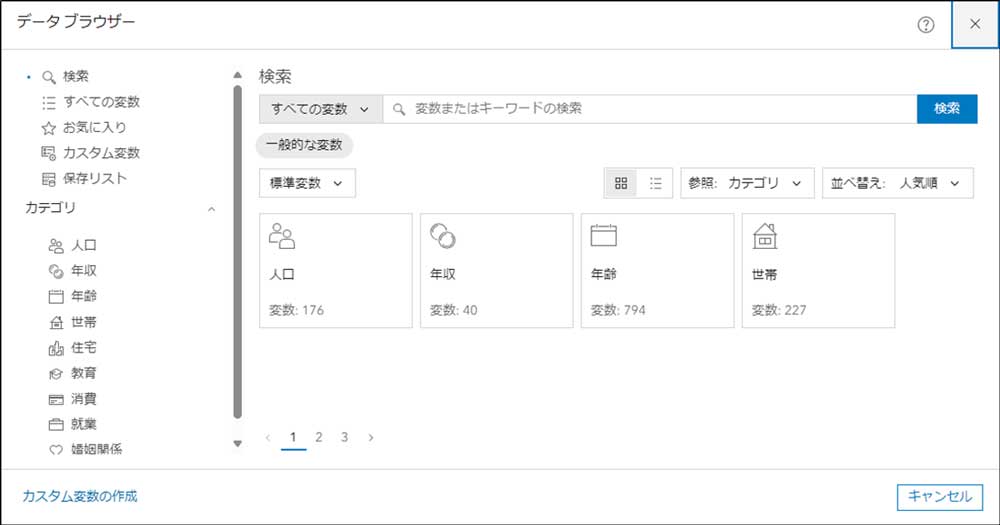 データ変数のカテゴリを常に切り替えできる他、並べ替え機能を強化しています。変数のフィルター オプションも充実しているため。使用したいデータ変数をすぐに選択できます。