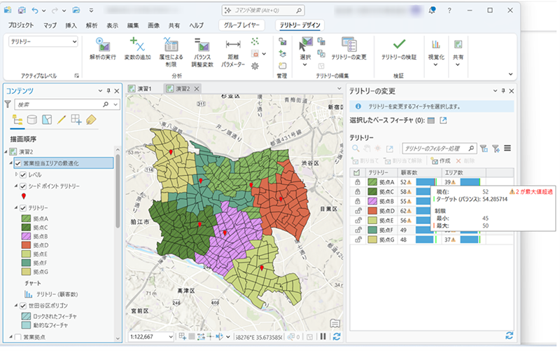 事前に設定した属性の最小・最大値などの制限値と各テリトリー内の値をチャートで表示できるようになりました。また、設定した制限値に違反する場合は警告がポップアップで表示されます。他にも、ドラッグ & ドロップでテリトリーの再割り当てできる機能や選択したテリトリーに隣接するテリトリーのみを表示する機能を追加しています。