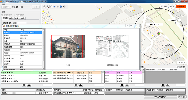 地図上に一元管理された世帯情報、家屋情報、被災調査の結果、現場写真などを簡単に検索し、証明書を出力できる