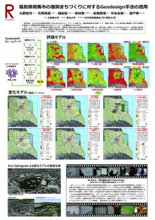 本マップは、東日本大震災から復興まちづくりについて、立命館大学地理学教室と東北大学災害科学国際研究所が中心となって企画したGeoDesignワークショップで得られた成果をまとめたものです。対象地域の福島県相馬市は、仙台市からも比較的近くに位置し、本震災による様々な地域的課題を抱えています。そこで私たちは、GISの得意とする地域分析の結果や複数の要因を地図上に重ねあわせ議論するGeoDesignのフレームワークを援用し、復興に資するより良い地域デザインやデザイン手法の可能性について検討しました。