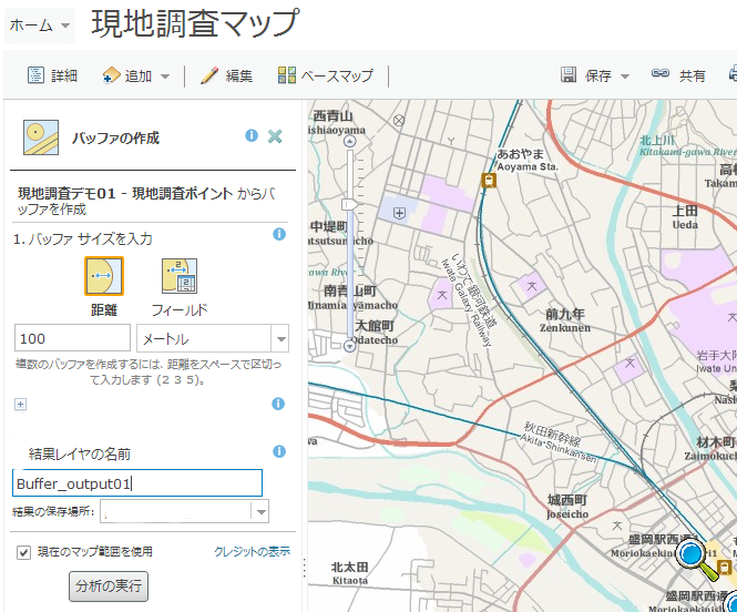 ArcGIS for Desktop ではおなじみの、いくつかの空間解析処理を ArcGIS.com マップ ビューア上から実行できるようになりました。例えば、ポイント フィーチャの集約、バッファの作成(図 3)、運転時間エリアの作成、境界のディゾルブ、レイヤのマージ、レイヤのオーバーレイといった処理です。