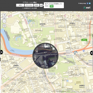 ArcGIS Online で利用できるアプリケーション テンプレートに、新しく「スワイプ」が加わりました。このテンプレートでは、二種類のウェブ マップや、同一ウェブ マップ内の二種類のレイヤを二分割画面やスパイグラス(のぞき窓)(図 2)のユーザ インタフェースで比較することができます。