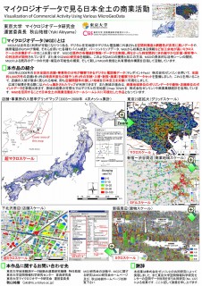 近年、空間的・時間的な解像度が非常に高く、尚且つ日本全土をカバー出来るビッグデータ=「マイクロジオデータ」が利用可能になりつつあります。本作品はデジタル電話帳から得られる店舗・事業所1件1件の時系列変化データ、商業地域の分布と範囲が分かる商業集積統計、建物の位置・形状が観察できる住宅地図を活用しています。こうした様々なマイクロジオデータを駆使することで日本全土の商業活動をスケールシームレスに可視化した事例です。