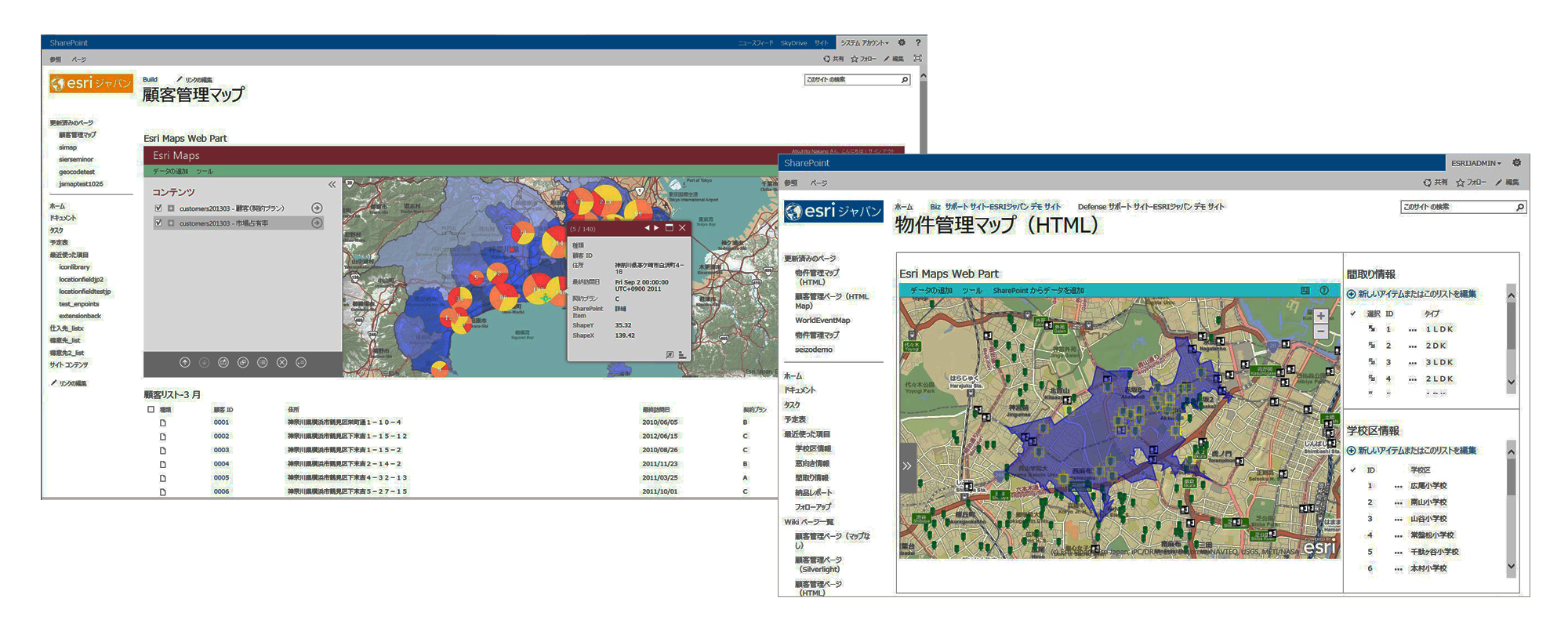 Esri Maps for SharePoint は、顧客、店舗、施設、スタッフなどといった位置情報が付与されているデータを、地図上で展開することにより、新たな切り口で情報を視覚化、分析できる製品です。これまでSharePoint®内で、文字情報として共有していたアドレスをマップに表現することで、具体的なイメージを描きながら、業務の効率化を見直すことが可能です。