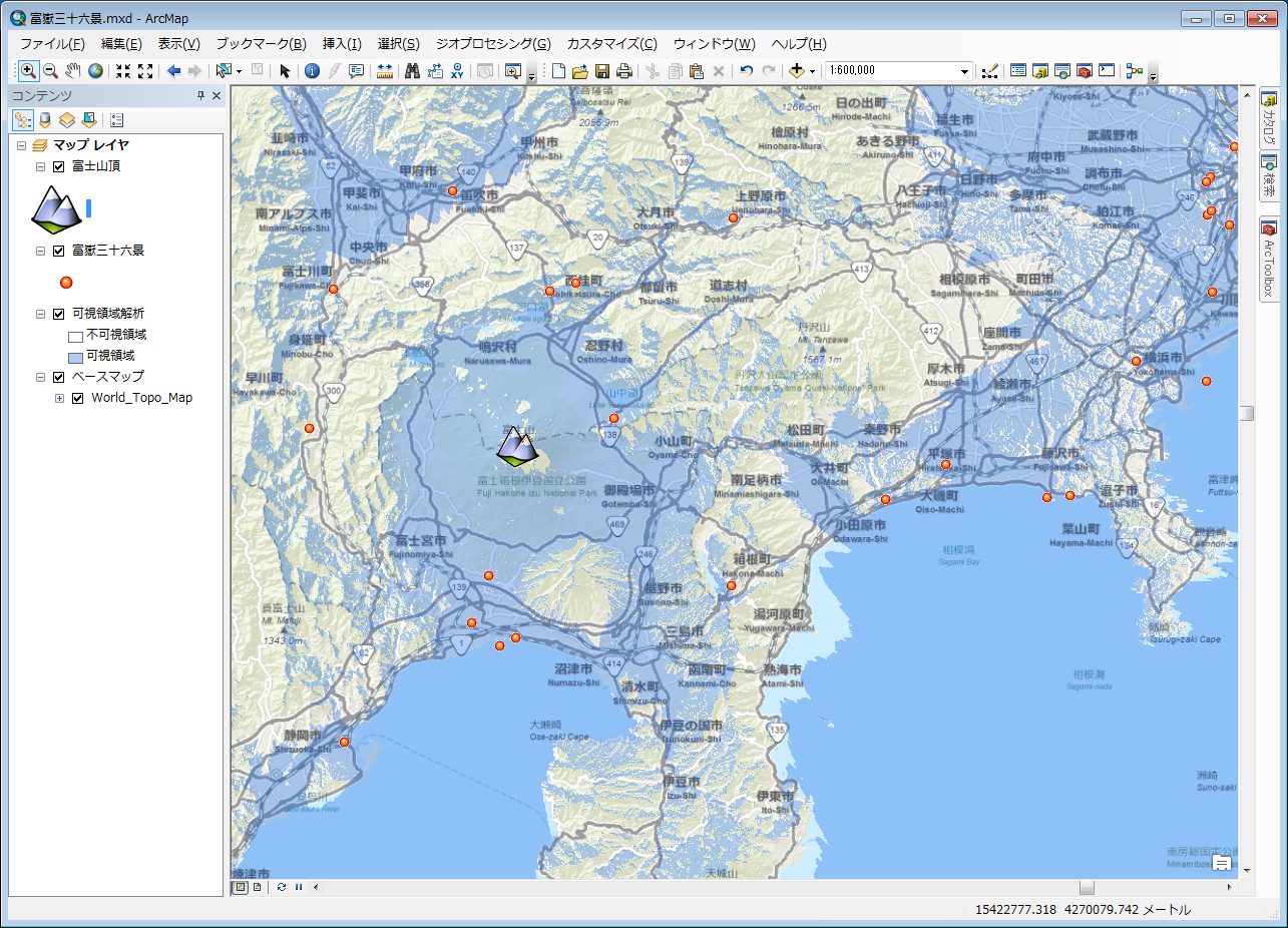 実際に描かれた場所の不明な浮世絵が数枚あって、ポイントを作成するのに苦労しました。ArcGIS for Desktop の Spatial Analyst エクステンションを用いて可視領域解析を行って、「この辺りではないか?」と一般的に言われているあたりから、さらに絞り込んで描かれたポイントを予測しました。