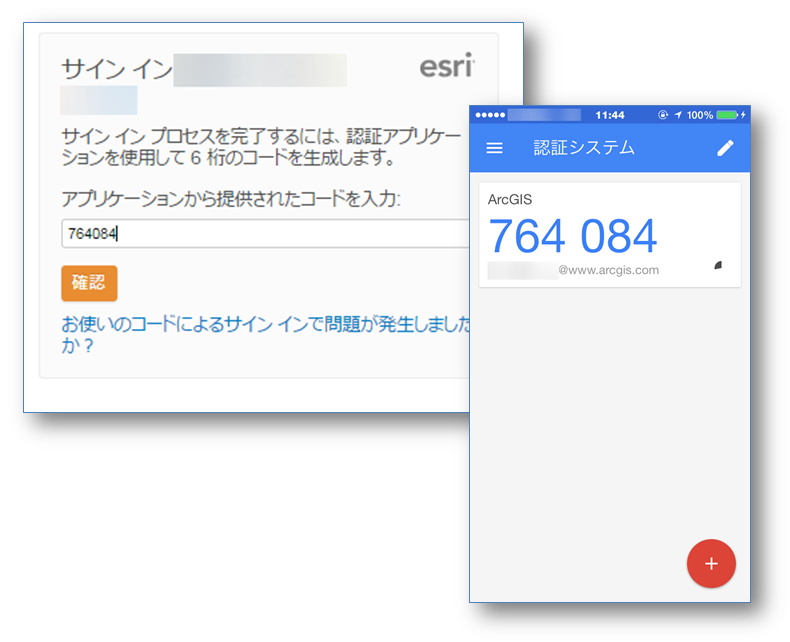 ArcGIS Online での 2 段階認証は、ユーザ ID とパスワードを入力した後、スマートフォン用の認証アプリケーションである「Google Authenticator(iOS版、Android 版)」から発行される 6 桁の数字を入力することでサイン インが完了します。