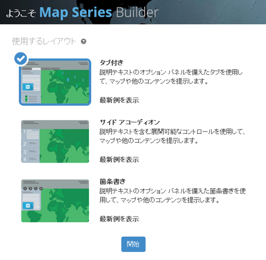 複数のマップとその他のコンテンツを表示するストーリー マップの新しいテンプレートです。タブ、サイド アコーディオン(展開可能なコントロール)、箇条書きの3つのレイアウトからデザインを選択してストーリー マップを作成できます。