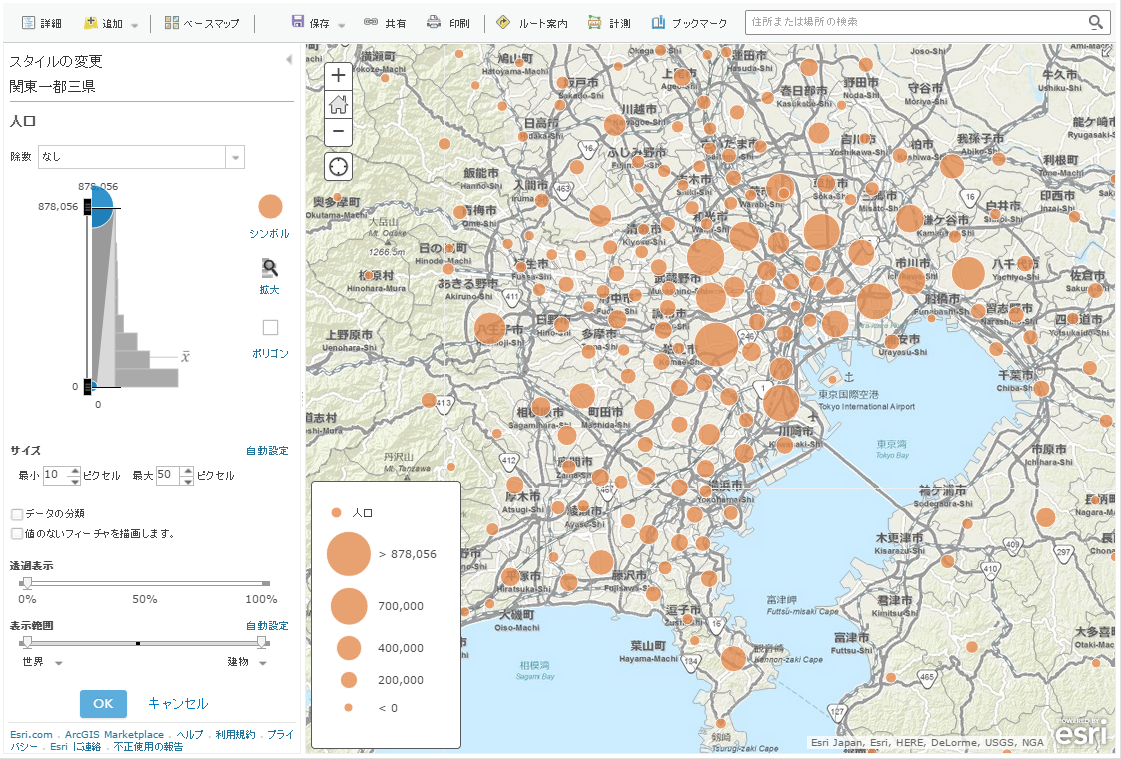 マップ ビューアーでレイヤーのシンボルを設定する際に、最適な表示方法を提示する機能が追加されました。指定したフィールドの属性値に合わせて、最適なシンボルを設定したり、使用しているベースマップに適したシンボルを設定します。また、レイヤーを表示する縮尺範囲を自動的に設定します。ポイント レイヤーをヒートマップで表現する機能も追加されました。