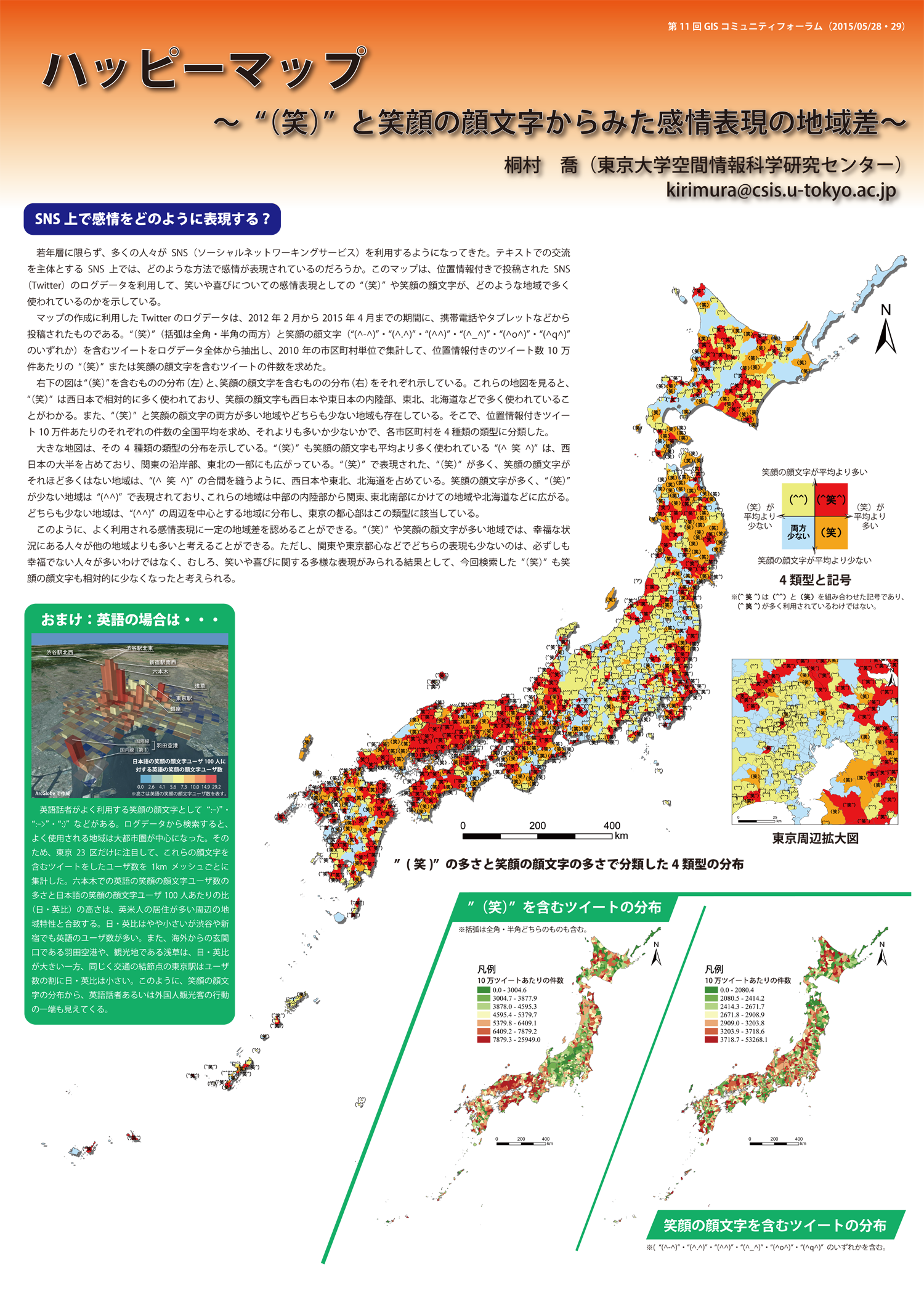 位置情報付きで投稿されたSNSのログデータには、ユーザの様々な感情が文字や言葉として表現されており、このマップは、“(笑)”や笑顔の顔文字がどのような地域で多く使われているのかを示している。“(笑)”は西日本で相対的に多く使われており、笑顔の顔文字も観光地や西日本などで多く使われている傾向にある。一方で、東日本ではそのような表現が必ずしも乏しいとは言い切れず、表現の多様化によって、相対的に使用頻度が低くなっているように考えられる。