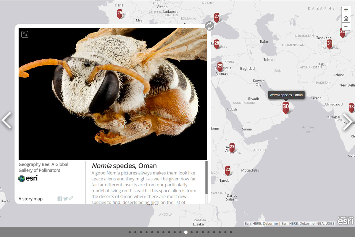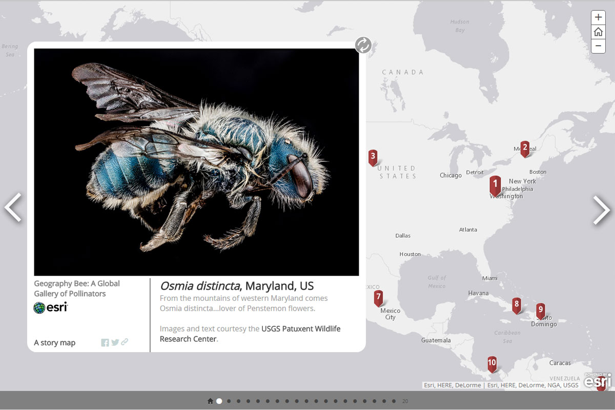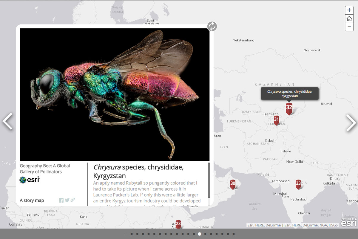 本マップはArcGIS Onlineでカスタマイズしたテンプレートで作成しています。マップやハチ画像小窓の右上にある相互の矢印をクリックすると、ハチの拡大写真と生息地の地図を切り替えることができます。