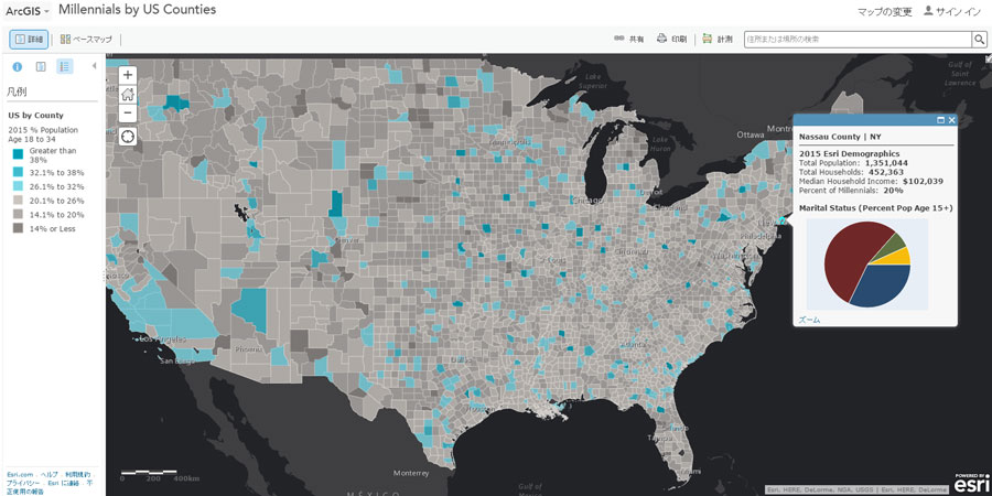 日本の若者の結婚観の変化や晩婚化がしばしば取り上げられますが、アメリカでも現在の20代から30代前半までの世代「ミレニアルズ」の晩婚化が顕著になっているそうです。その理由は主に、失業や低収入による経済面での不安、結婚観の変化など、日本の晩婚化との共通点が見えてきます。本Webマップは、Esri 人口統計データを利用し、2015年の18歳~34歳までの人口の割合を色別に表したものです。 各自治体のポリゴンをクリックすると、ミレニアルズの占める割合(%)、その地域の収入の中間値、既婚・未婚などの割合が表示されます。ミレニアルズの割合が高いほど、既婚と未婚の割合にあまり差がないことがわかります。