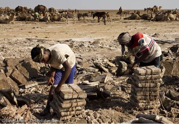 ここで取られる塩は2,000年間、手作業によって採掘されています。この手作業には、大きく分けて2つの違った役割があります。岩塩を割り、持ち上げる役と、もうひとつは1キロの塊ごとに岩塩をまとめる役です。労働者は、1日のこれらの作業を通してわずか約2ポンド(約130円)を稼ぎます。
