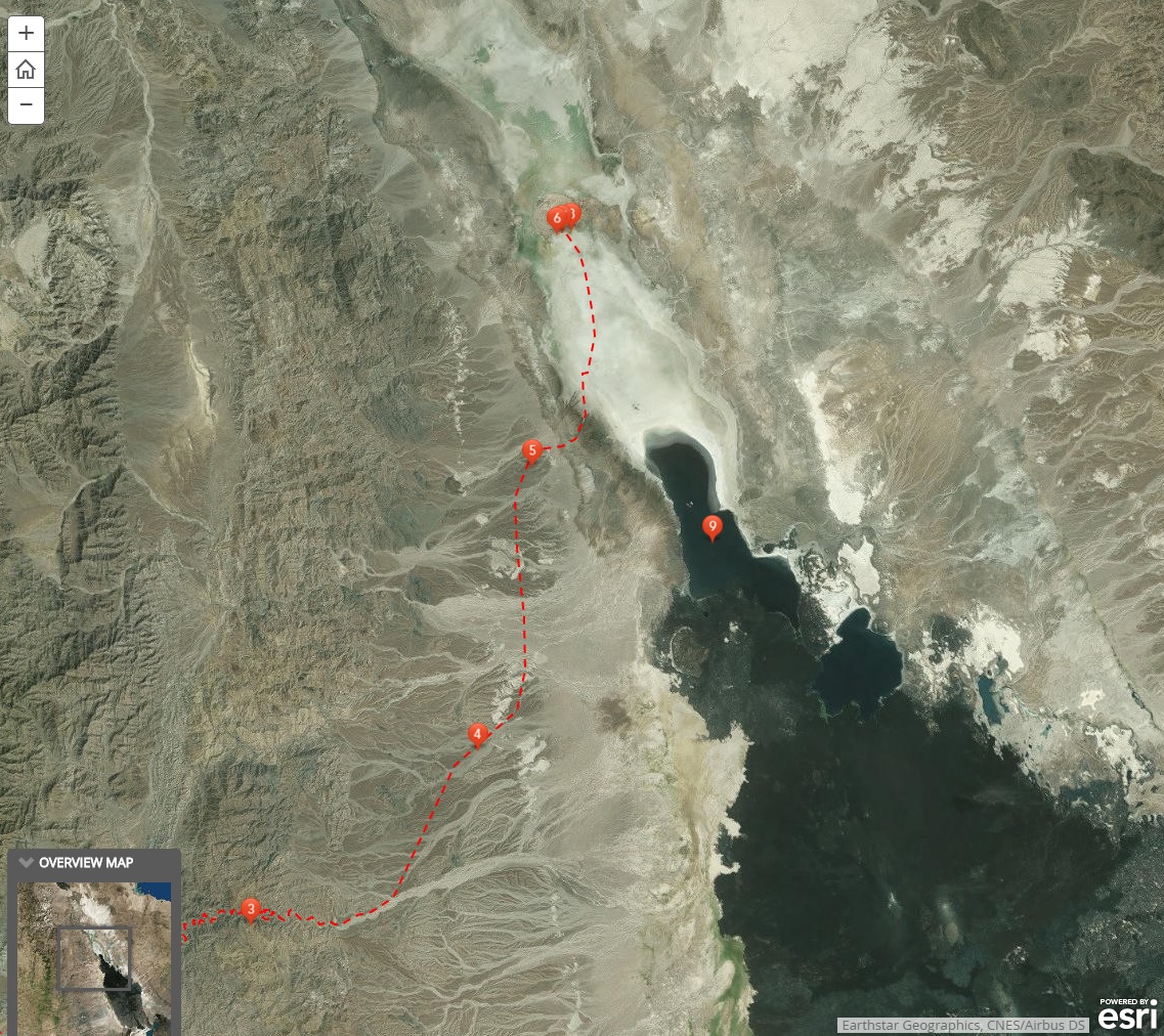 このストーリーマップの3ページ「Route map」では、起伏地図、衛星画像、世界地図と背景地図の切替ができます。