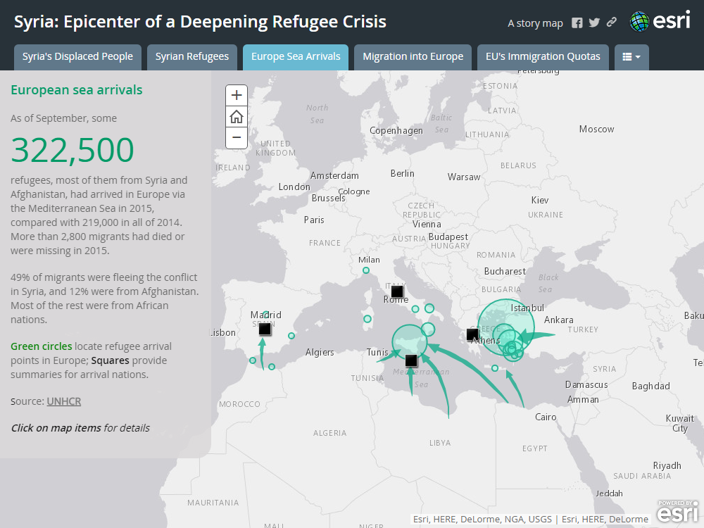 2015年9月時点で、32万2千500人の難民が地中海を渡りヨーロッパへ流入しました。(2014年はトータルで21万9千人) 2千800人以上の人々がこの過程で命を落とす、または行方不明となっています。ヨーロッパに流入する難民の49%がシリアから、12%がアフガニスタンから、そしてその他多くがアフリカ諸国からとなっています。