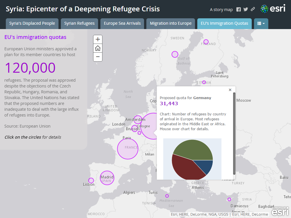 紫の丸をクリックすると、EUより課せられた各国の難民受け入れ数が分かります。