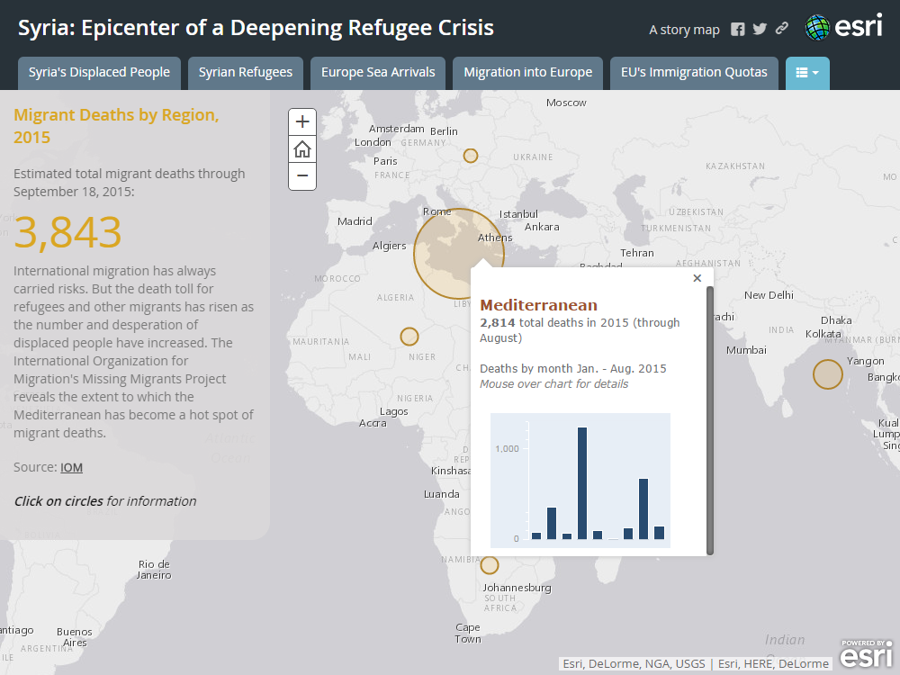 2015年9月18日付の移民・難民の死亡者数はおおよそ3,843人と言われています。もともと国際移住はリスクを伴うものでしたが、昨今の事態により国を追われる人々が増え、死亡数も増加しました。国際移住機関によると、地中海はそのホットスポットとなっています。