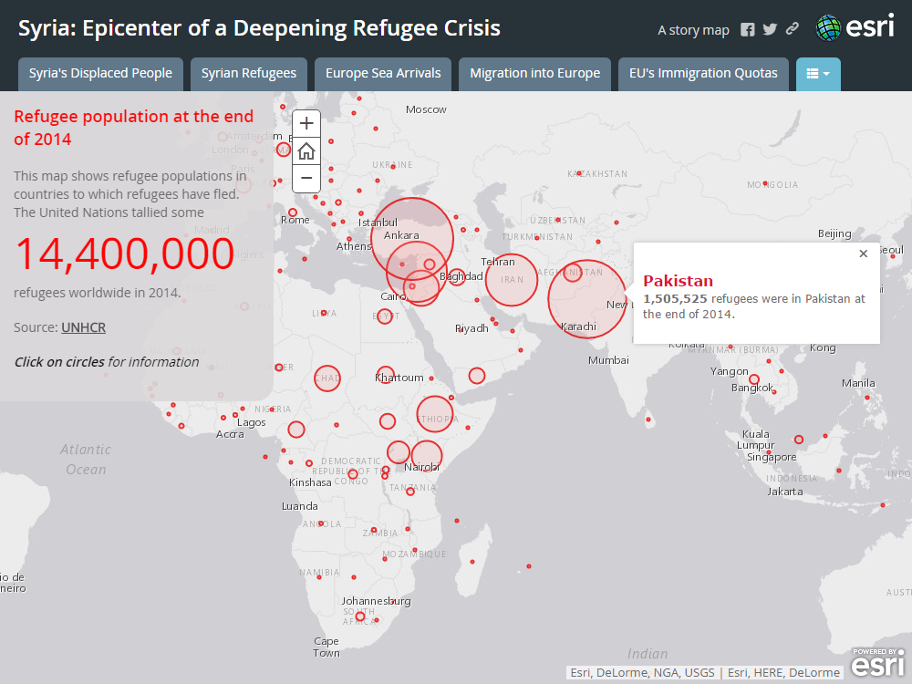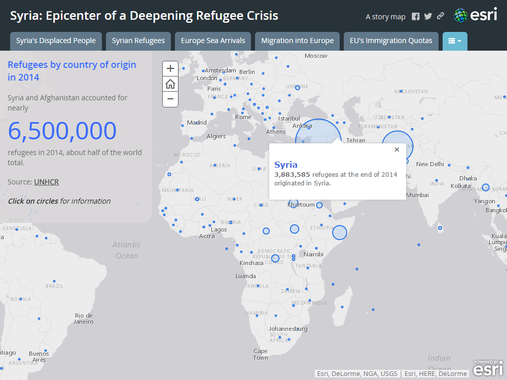 2014年の国連の調査によると、世界の約半分の難民、650万人がシリアとアフガニスタンの人々となっています。青い丸の大きさで各国からの難民の数を表しています。