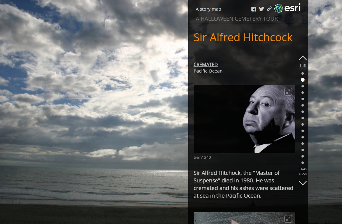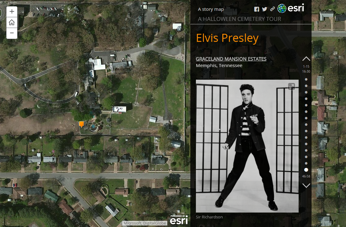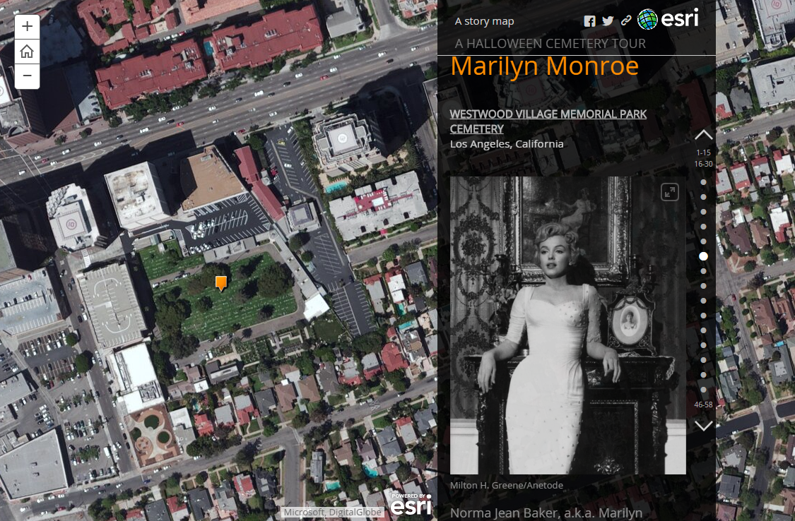 今回はそのような起源のあるハロウィンにちなんで、米国 Esri社が作成したマップをご紹介します。本マップは世界中の著名人や悪名高い犯罪者(!)達のお墓の場所を地図上に示しています。人物については知っていても、お墓の場所まで知っている人は少ないのではないでしょうか。もしかしたら彼らも家族のもとを訪ねに来ているかもしれません…。本マップ上で「ハロウィン 墓地ツアー」をしてみるのはいかがでしょうか。