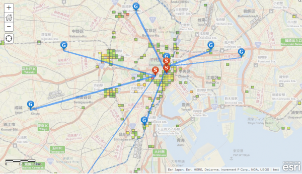 また今回、「SAP HANA」に格納した現在の状況に関するデータと「HADB」に蓄積した履歴データを活用した将来予測を行い、現在の状況と将来予測の結果を「ArcGIS」の地図画面上で瞬時に表示できることを検証しました。検証にあたっては、東京大学空間情報科学技術研究センターが提供する、約130万人分の移動履歴とその交通手段に関するデータ(人流データ)*5を活用し、タクシーの最適配車を想定したシミュレーションを実施しました。具体的には、まず、東京首都圏のある特定日時における人流データを現在の状況と仮定し、そのデータをもとに「SAP HANA」で「現在の混雑箇所」を把握します。そして、現在の混雑箇所から数十分後に移動する可能性が高い複数地点を、「HADB」に格納した膨大な履歴データの中から統計的に導き出すことで将来予測を行いました。これらの結果を「ArcGIS」の地図画面上に高速に表示することができました。