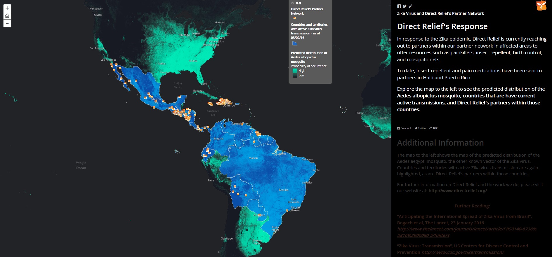 現在、ジカ熱の流行拡大においてNGO団体ダイレクトリリーフは彼らのパートナーネットワークを通して、蚊帳・鎮痛剤・経口避妊薬・防虫剤などの)支援物資を提供しようとしています。