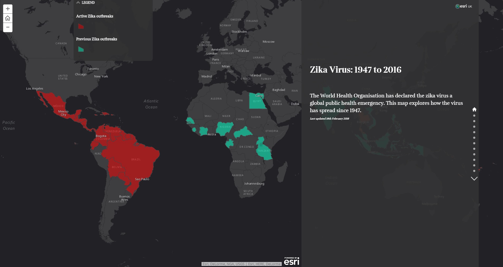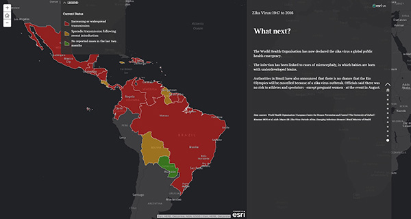 国内で2例目となる感染者が今月(2016年3月)に入って確認されるなど、「ジカ熱」に関するニュースはまだ落ち着く様子を見せません。本ストーリーマップでは、1947年から2016年までのジカ熱ウィルス感染地域の移り変わりを紹介しています。過去の流行地域と現在の流行地域を比較してみてください。(Esri UK 作成)
