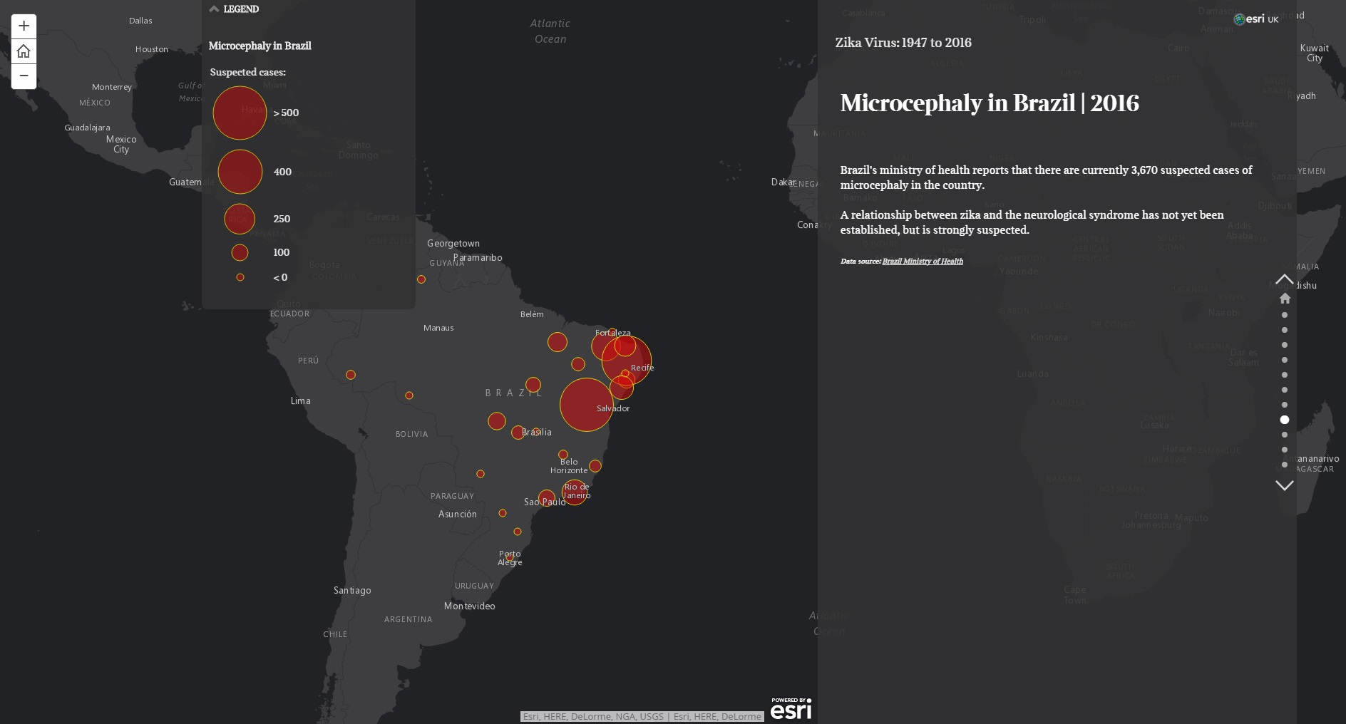 ブラジル保健省(ministry of health)によると、2016年3月現在、3,670件の小頭症の疑いのあるケースが確認されています。ジカ熱ウイルスと小頭症との関係が強く疑われています。