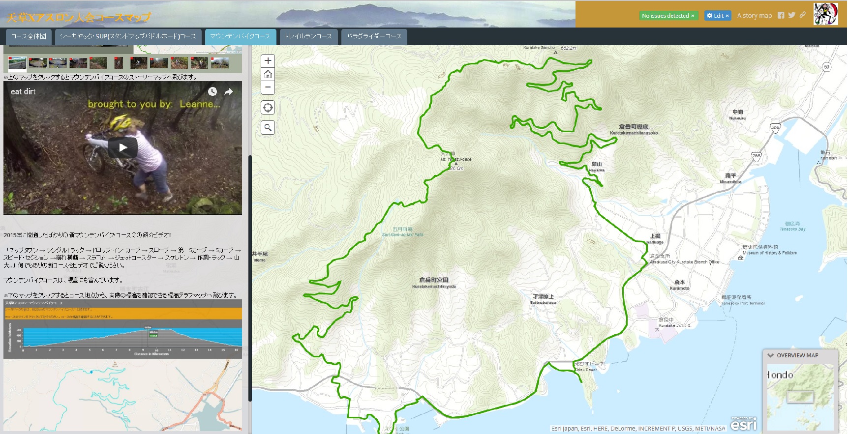 大会の参加希望者にコースの魅力を伝える方法はさまざまです。天草Xアスロンには山中の急斜面をマウンテンバイクで駆け下るコースが用意されています。実際のコースを走ったYouTubeビデオを埋め込んだり、コースの高低差がすぐに分かる標高マップをリンクするなど、ストーリーマップを用いることで表現豊かに大会をアピールすることが可能です。