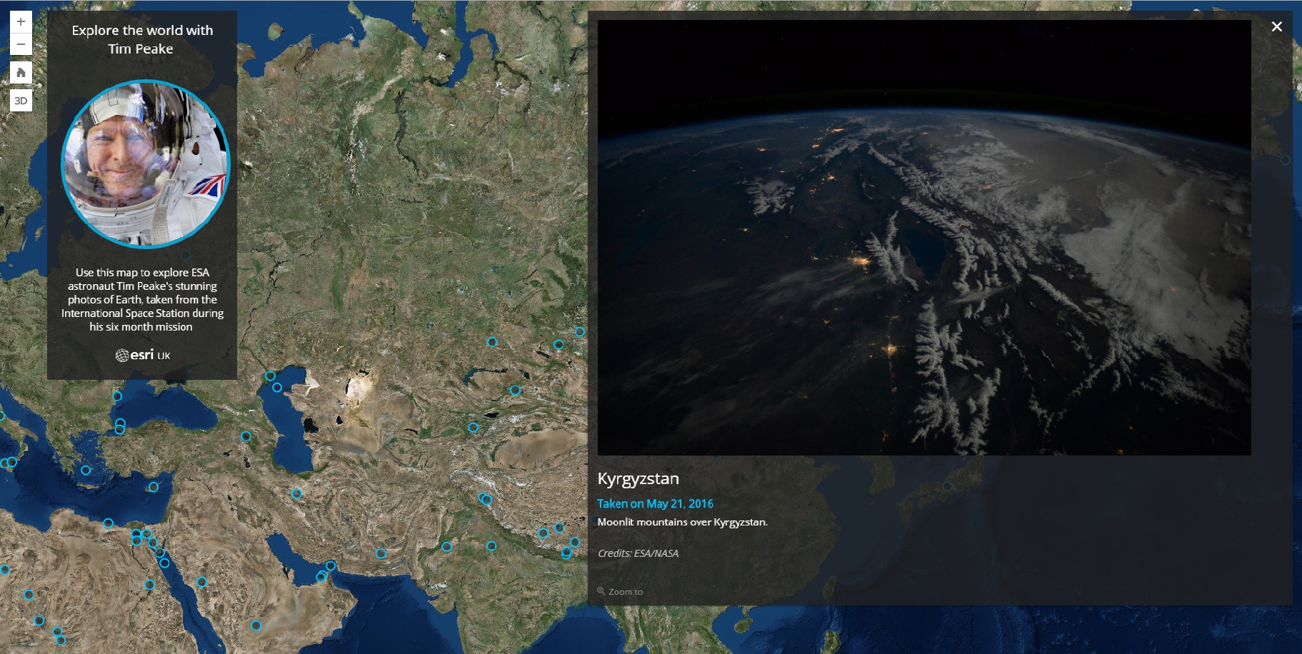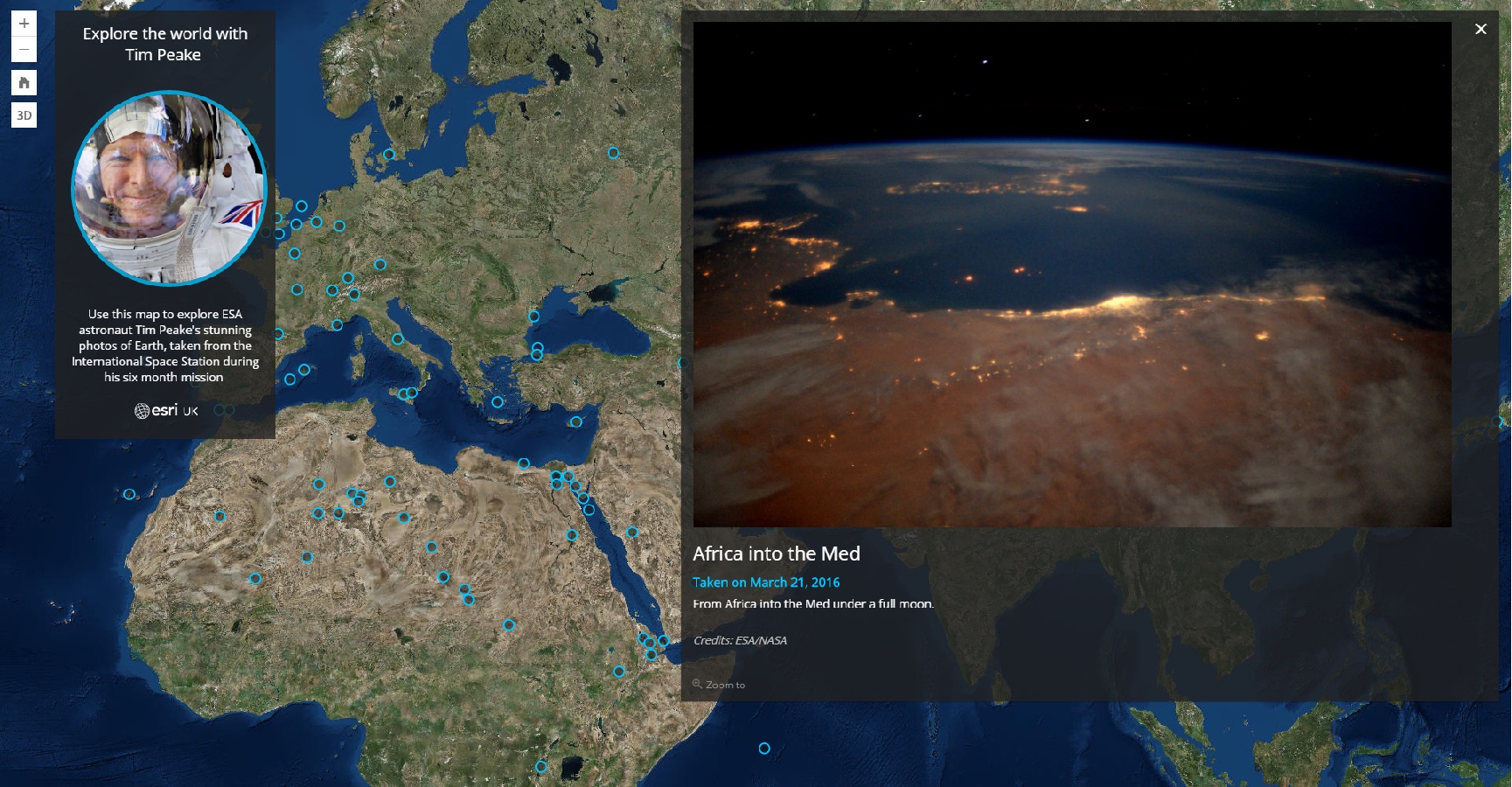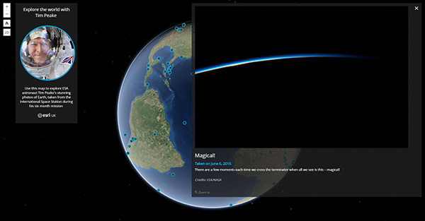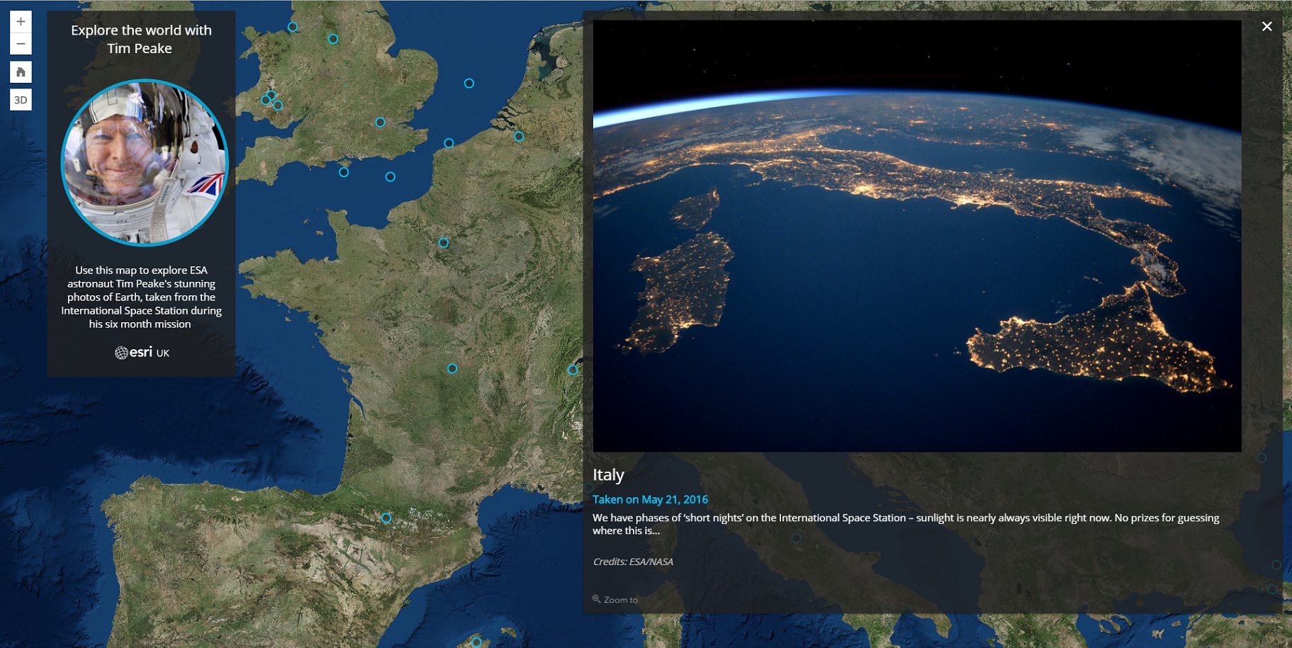 英国の宇宙飛行士 ティム・ピー氏が6ヶ月に及ぶ宇宙滞在期間中に国際宇宙ステーションから撮影した美しい写真を、Esri UK社がストーリーマップに仕上げました。